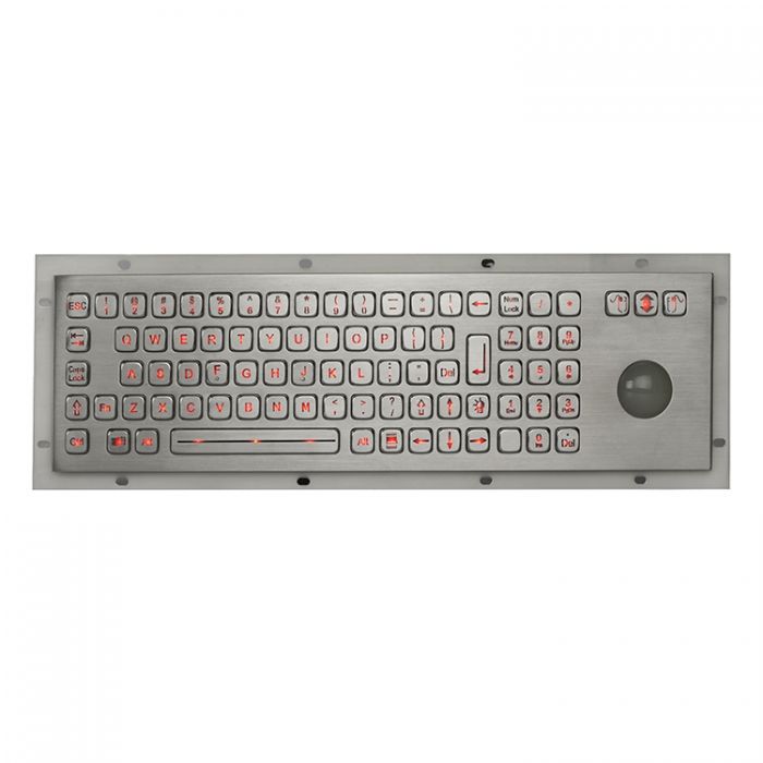 84 Keys Compact Format IP65 static Vandal Proof Stainless Steel industrial Keyboard with IP65 static 38.0mm transparent touch ball module, industrial PCB with carbon-on-gold key switch technology with long stroke 2.0mm with extremely good tactile feeling for fast and accurate input without any noise, numeric keypad (optional PINPAD with Encryption Electronics Controller supporting DES/TDES), 3 mouse buttons designed for right & left clicking and scrolling up and down with ball rolling, with rear panel mounting solution. Stainless steel key caps etched out via special professional way and filled with transparent epoxy for backlight out, with adjustable industrial backlight included. (Blue, Red, White colours etc. optional). Dimensions: 392.0mm x 110mm (front panel)