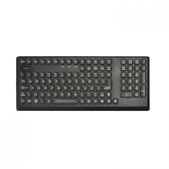 108 keys IP68 dynamic rated washable industrial membrane keyboard with full keyboard functionalities with integrated numeric keypad and function keys on the upper line, IP65 dynamic sealed and ruggedized tough touchpad for fast and accurate cursor position, 2.0mm thickness industrial metal dome PCB with gold-on-gold metal dome key switch technology with short stroke 0.45mm with excellent tactile feeling for reliable data input, with Clean key for easy cleaning via lock/disable the entire keyboard without needing to take the keyboard from PC, surface mounted extremely flush with anti-microbial, durable and scratch-proof polyester withstand to most chemicals and liquids under the harshest environments, ruggedized and backed with 3.0mm aluminium plate with sand blasting & oxygenation treatment, mountable movable desk top version with robust polycarbonate case.